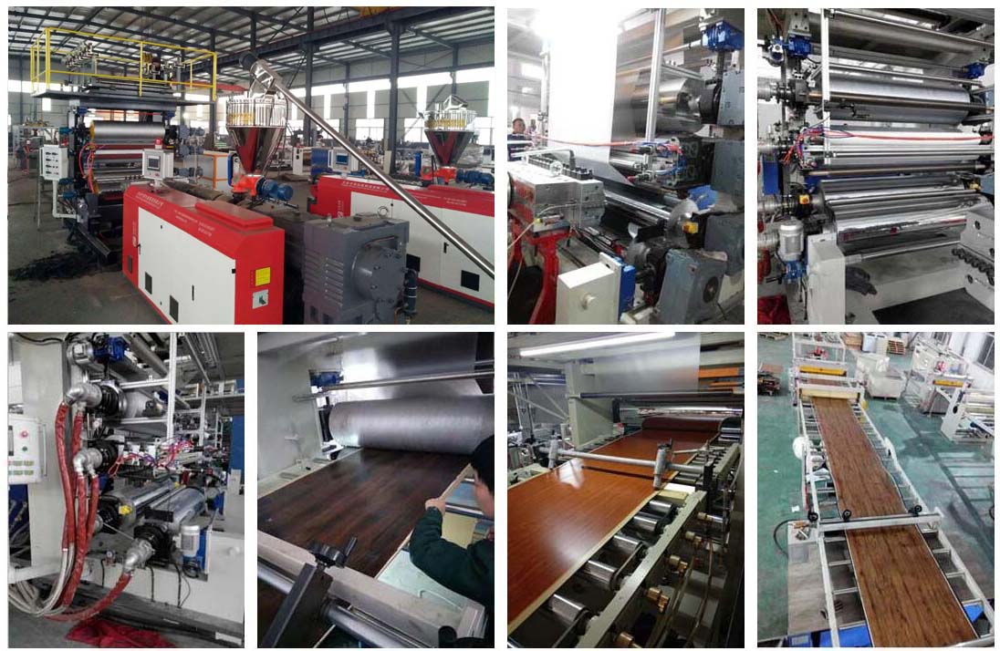 石塑地板生产线四辊加一辊生产线设备,挤出基材,热敷彩膜装饰层和耐磨层,实现一步法,在同一台设备上同时完成。第一,表面可热敷上各种不同颜色的彩膜装饰层;第二,可直接在板材装饰层上热敷耐磨层;第三,可直接做上各种各样浮雕木纹及各式各样的花纹;第四,底层软垫消音层,也可直接热敷上去。以上四条均可同时在一条生产设备上完成多层结合为一体。可减少表层处理花纹,耐磨的设备。减少人工及设备的投资,大大降低PVC地板生产成本。